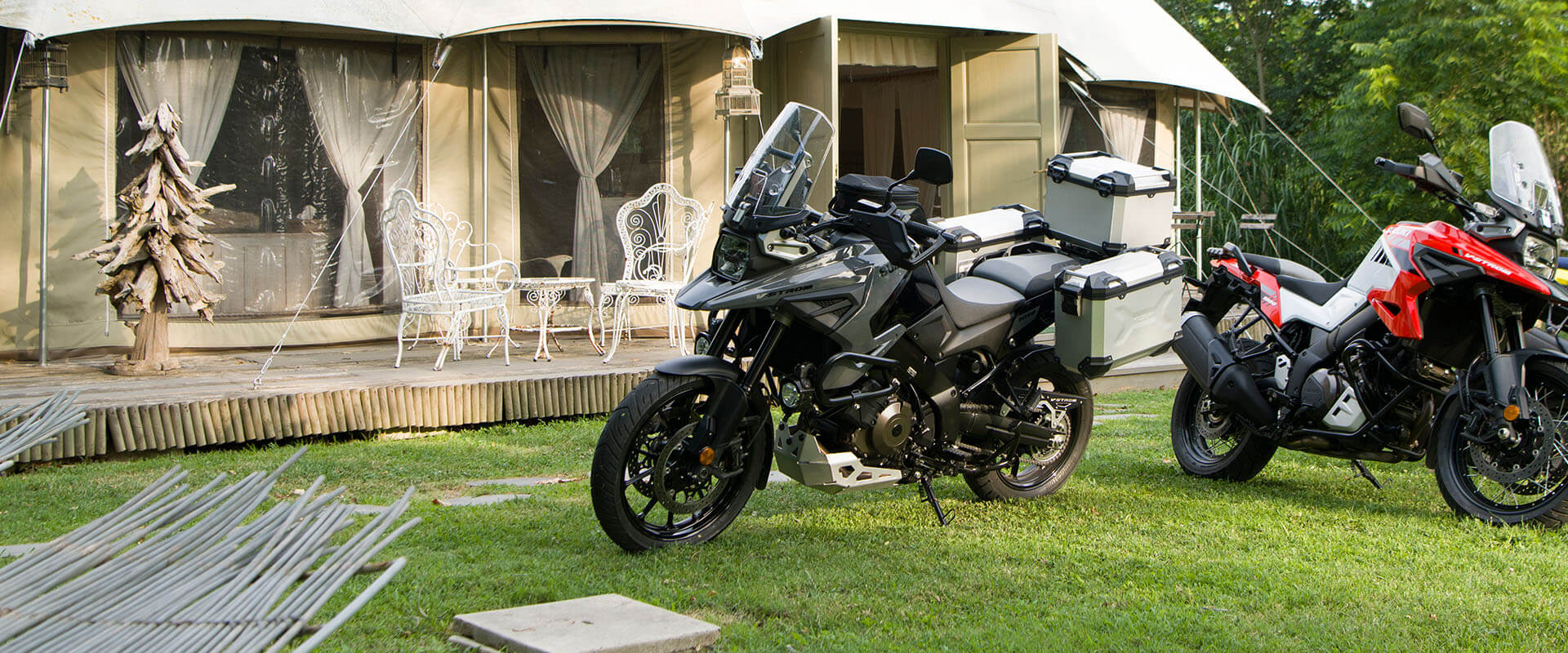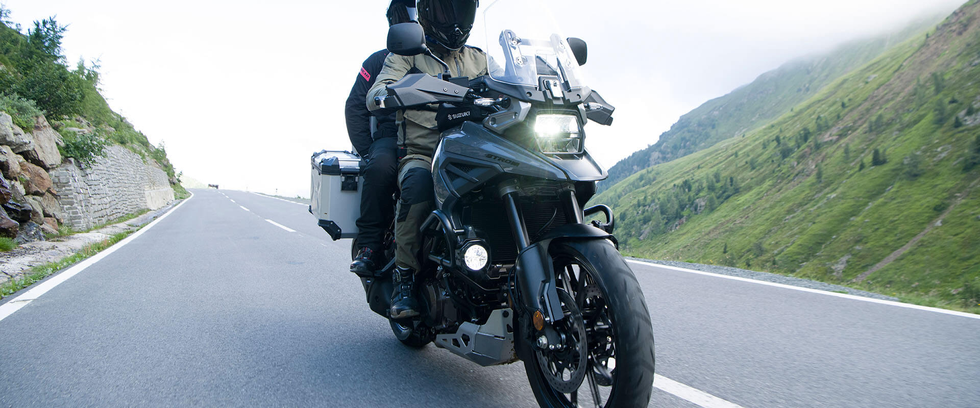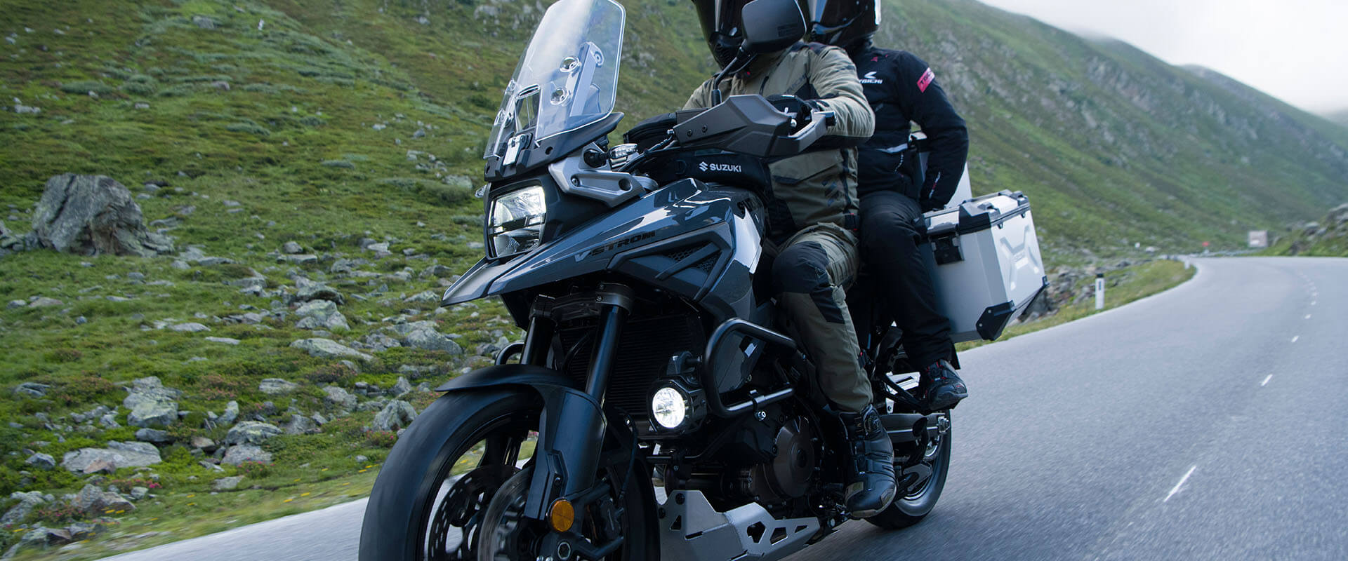 S unutarnjom cijevi promjera svega 43 mm, predopterećena opruga i prigušenje kompresije/odbijanja KYB preokrenutih prednjih vilica može se podesiti u potpunosti, omogućavajući postavljanje ovjesa na temelju želja vozača ili uvjeta uporabe. Stražnji ovjes je s donjom sponom mono-šok, a predopterećenje se može jednostavno podesiti zakretanjem brojčanika rukom. V-STROM 1050XT koristi DID aluminijske naplatke sa žbicama, dok je model V-STROM 1050 opremljen 10-krakim kotačima od lijevanog aluminija. Bridgestone Battlax Adventure A41 gume standardno su opremljene 110/80R19 radijalnom gumom sprijeda i 150/70R17 straga.